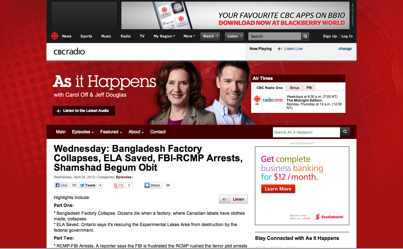 http://www.cbc.ca/asithappens/episode/2013/04/24/wednesday-ela-saved-bangladesh-factory-collapses-fbi-rcmp-arrests-shamshad-begum-obit/ Feel free to repost.All my art profits go to charity.